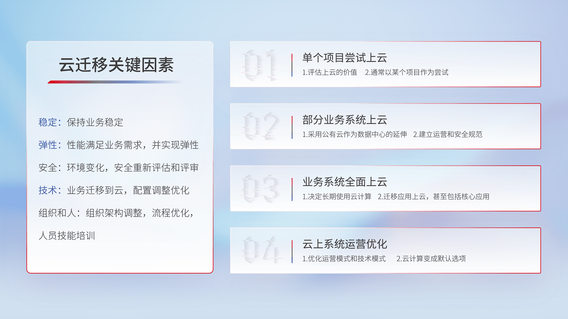 结合实际业务,,,,从规划设计、、、云平台选型、、云原生改造、、、数据迁移、、、集成交付,,迁移全过程为客户识别最佳上云路径,,做好风险识别管理,,,设计网络架构、、身份权限、、、、安全审计合规、、、操作审计、、、、日志审计、、监控告警策略、、、、多站点容灾设计等,,,对云上基础设施进行整体规划,,,,提升IT治理水平,,,,以满足弹性、、高可用、、、高性能的需求。。。