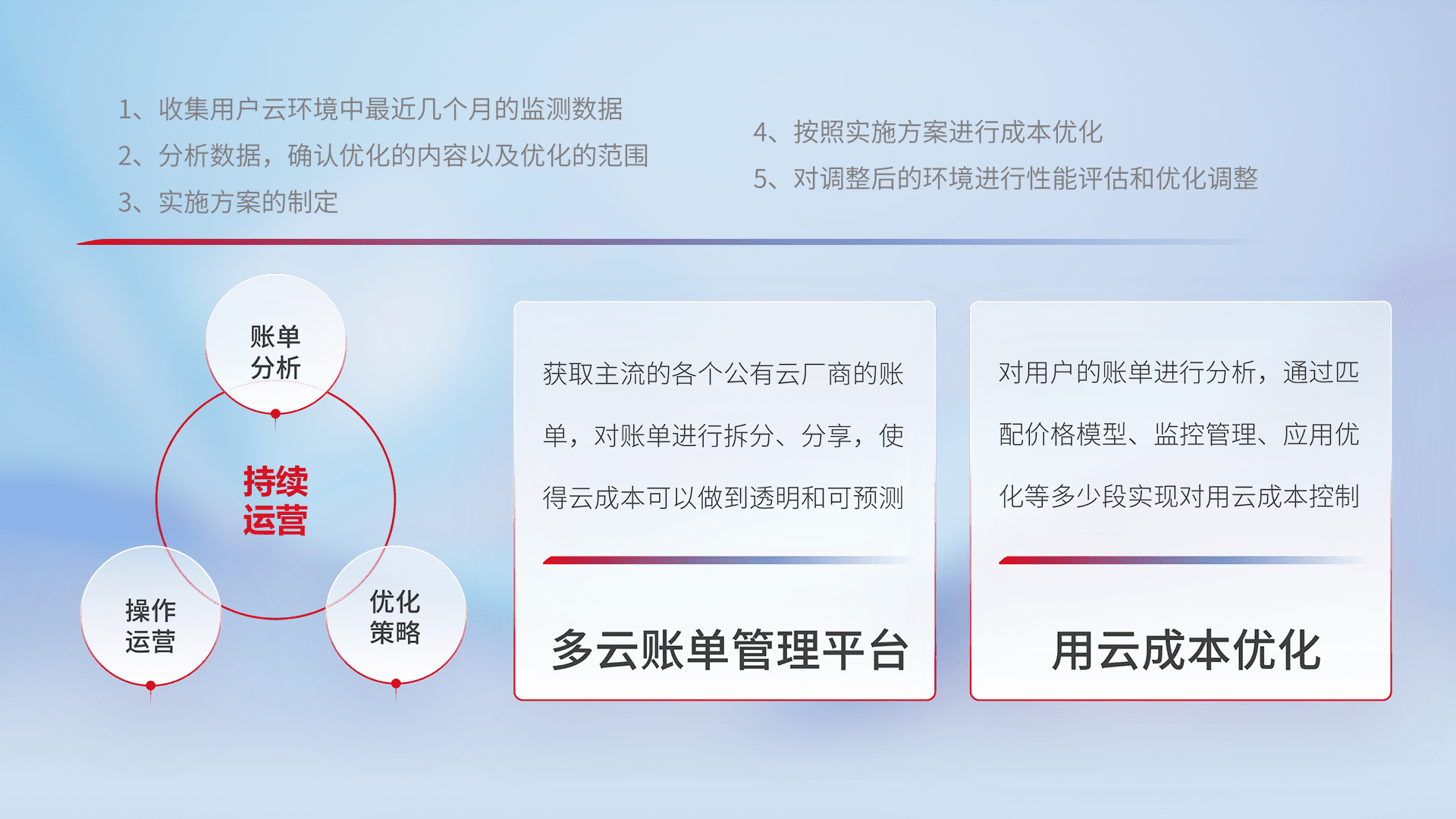 通过多云纳管,,,,以统一的资源数据模型把客户的云资源进行抽象和封装,,,进而实现对多云资源的统一操作,,保障云资源管理的可靠性、、、稳定性与可用性。。。。量身定制化运维内容,,配置、、、开发运维、、补丁管理、、、、备份、、、监控、、、、认证和访问管理、、、、审计和日常巡检等,,,保障在用云过程中的可靠度,,,稳定度以及高可用率。。